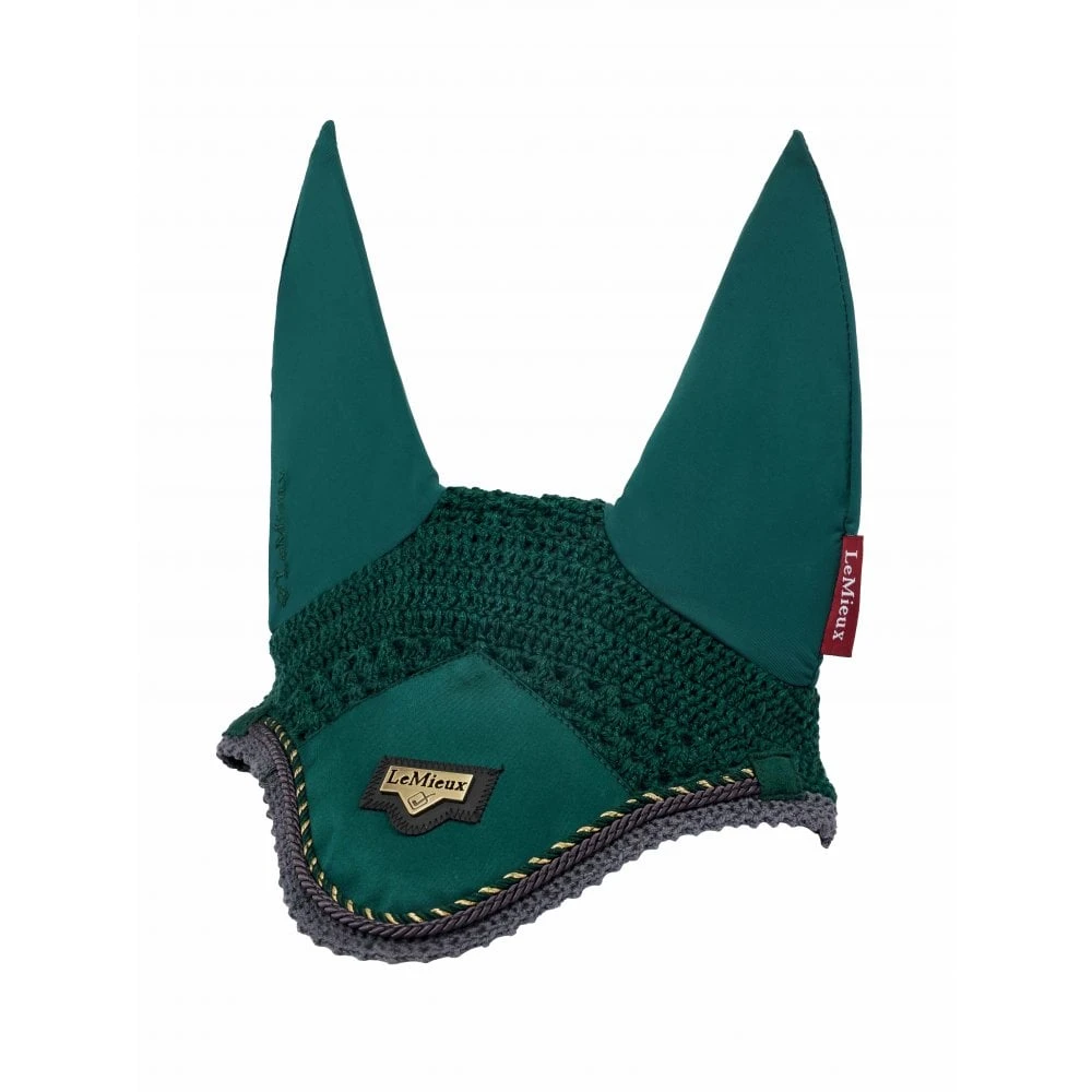 LeMieux Loire Satin Fly Hood – Spruce. These elegant fly hoods complement the characteristic LeMieux Loire embossed metal design and are a stunning addition to the collection. Beautifully made from three-way hand knitted crochet, with a sumptuous satin fabric front piece and soft stretch elastane ears.